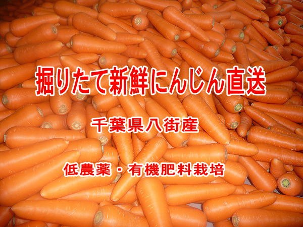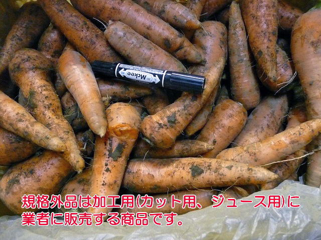 農園産(千葉県八街市)の採り立てにんじん、土付です。 外見上、欠点のないA級品の人参です。 人参の大きさはM〜2Lサイズが混ざっています。 10K箱入りと、お得な20K箱入りがございます。 鮮度を保つために専用の内袋を使用して箱詰めしてありますので 長期保存が可能です。 ※土付ですので、洗わなくては解らないシミなどが混入する場合が ございますのでご理解ください。 ※箱はリサイクルダンボールを利用しますのでご了承ください。 新らしい人参専用箱をご利用の場合はご用命ください。 〔箱代 10K箱・90円 〕 長期保存ができ、欠点のない人参をお求めの方に最適です。 |